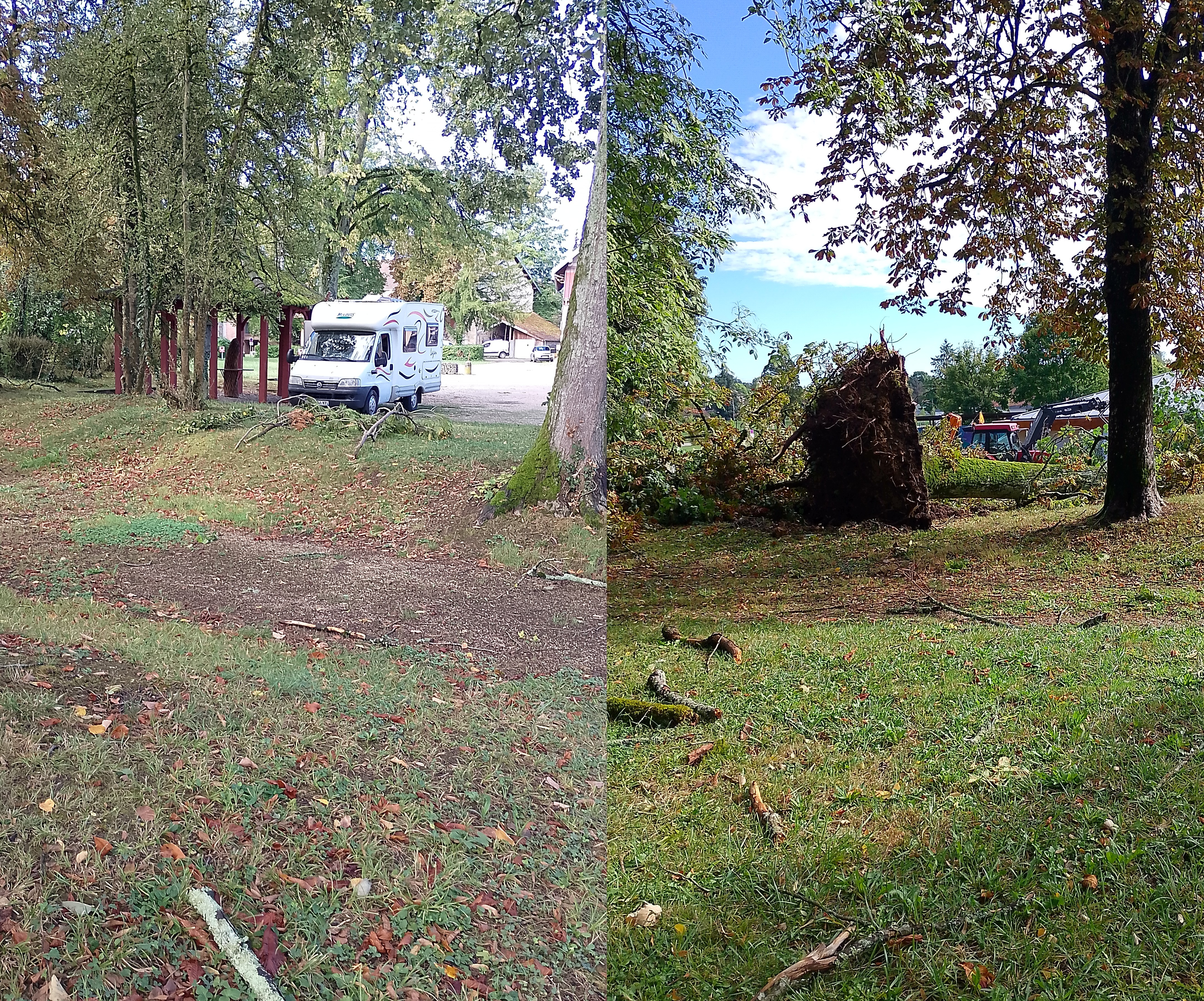 En rentrant à pieds du restaurant (voir article précédent), ça soufflait encore un peu et tombait quelques gouttes, mais pendant notre repas il y a eu une tempête d'environ une heure, assez pour faire quelques dégâts, nous sur l'aire de camping-cars, pas eu de soucis, coup de chance, au réveil nous avons vu pas très loin du camion des branches par terre, mais à une cinquantaine de mètres un gros arbre tombé à terre sur une cour d'école, donc les services techniques malgré que c'était un dimanche, n'ont pas chômé pour nettoyer la cour.